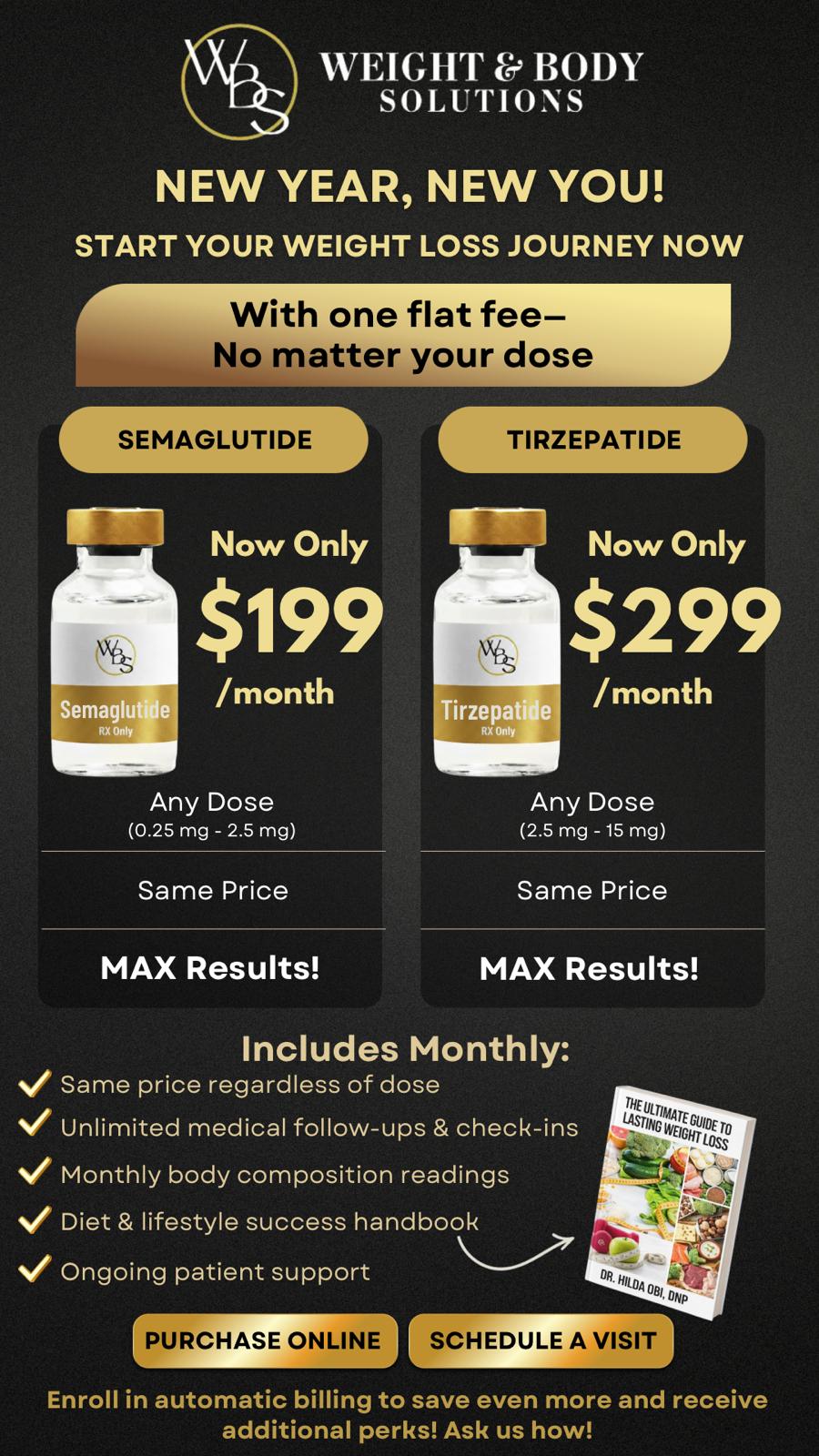 Start your weight loss journey with one flat monthly fee that never increases, no matter your dose. Plans include unlimited medical follow-ups, body composition readings, and ongoing patient support.